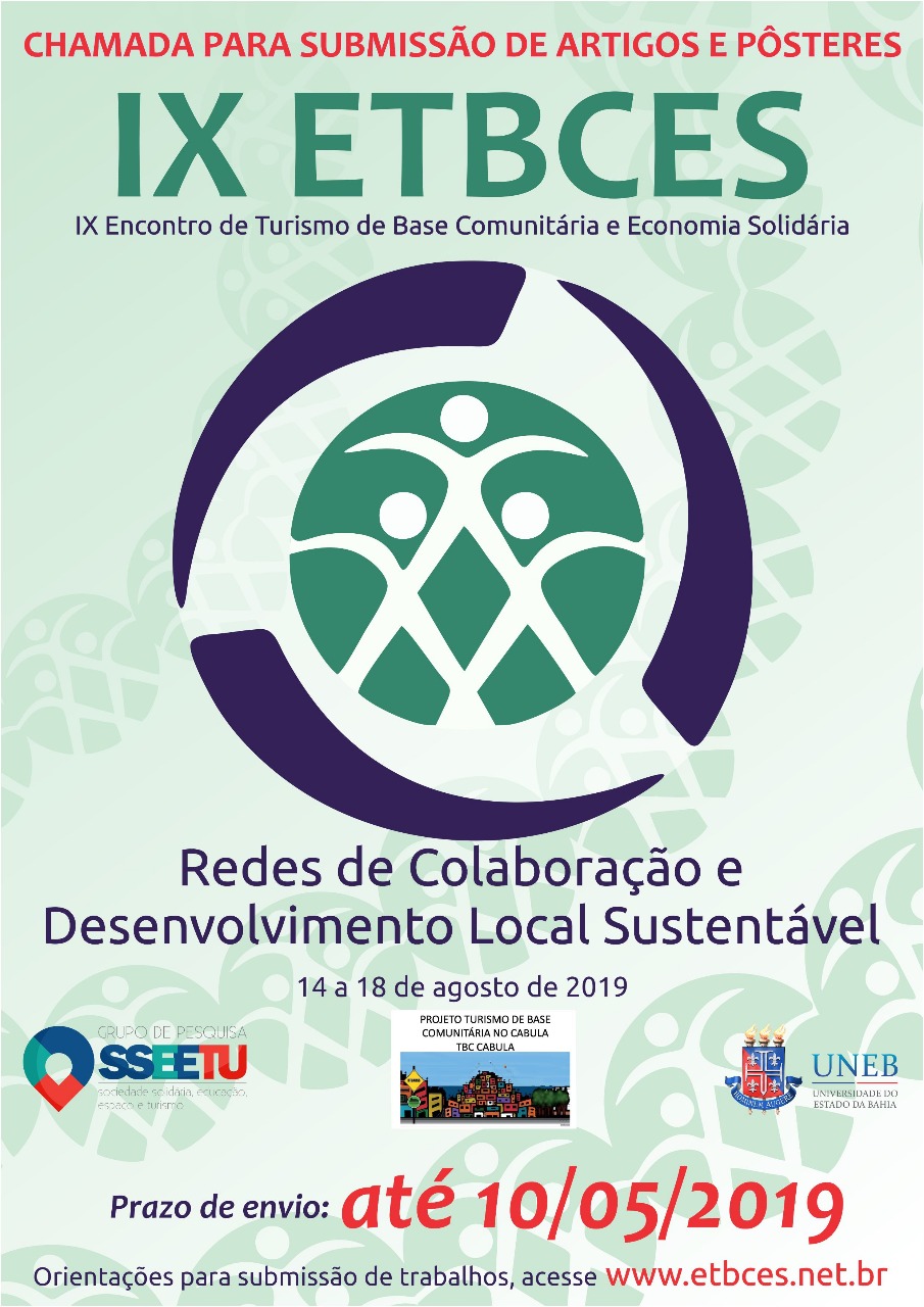 Vem ai o IX ETBCES - Encontro de Turismo de Base Comunitária e Economia Solidária. O evento acontecerá no período de 14 a 18 de agosto de 2019. Fique Atento! E se você tem interesse em apresentar trabalho científico, a submissão de artigos e pôsteres é até o dia 10 de maio de 2019.